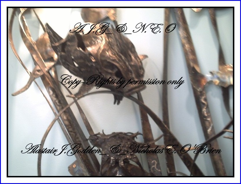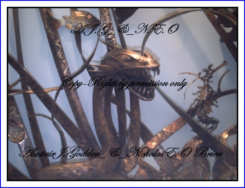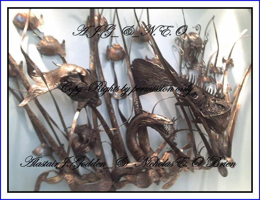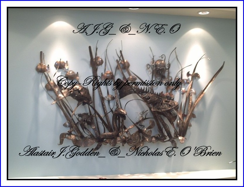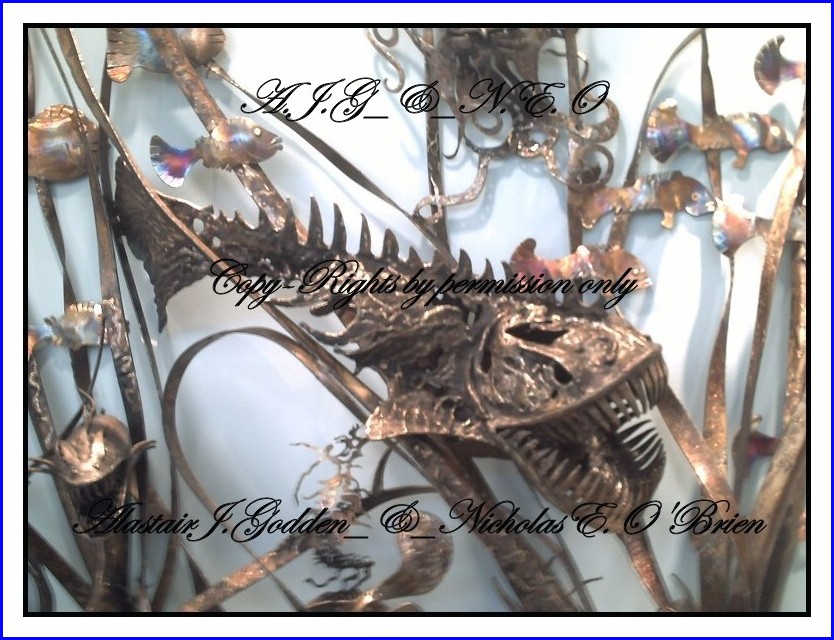 This newest vision by the artist Alec Godden is of burnt stainless steel and is a sculptured view of the sea bottom and has not been officially named by it's owner, but is already drawing admiring eyes by all that have the privilege to see this one of a kind stunning and somewhat shocking view out of the mind of this master artist of sculptured welded art.